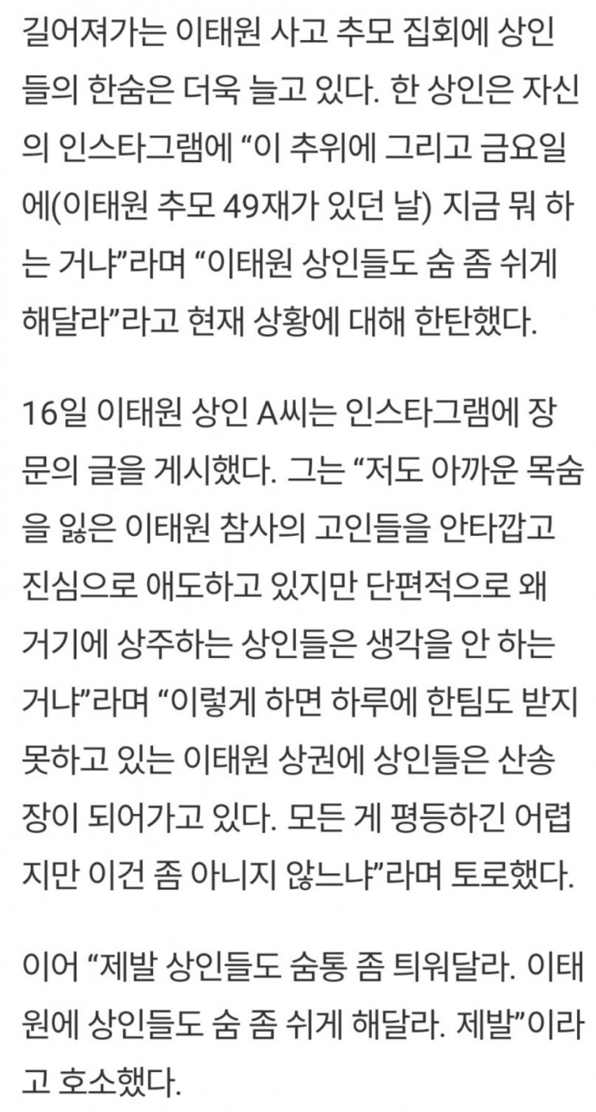 이태원 추모 집회와 추모 공간때문에 자영업자들과 상인들은 생계와 생존권을 위협받고 있다