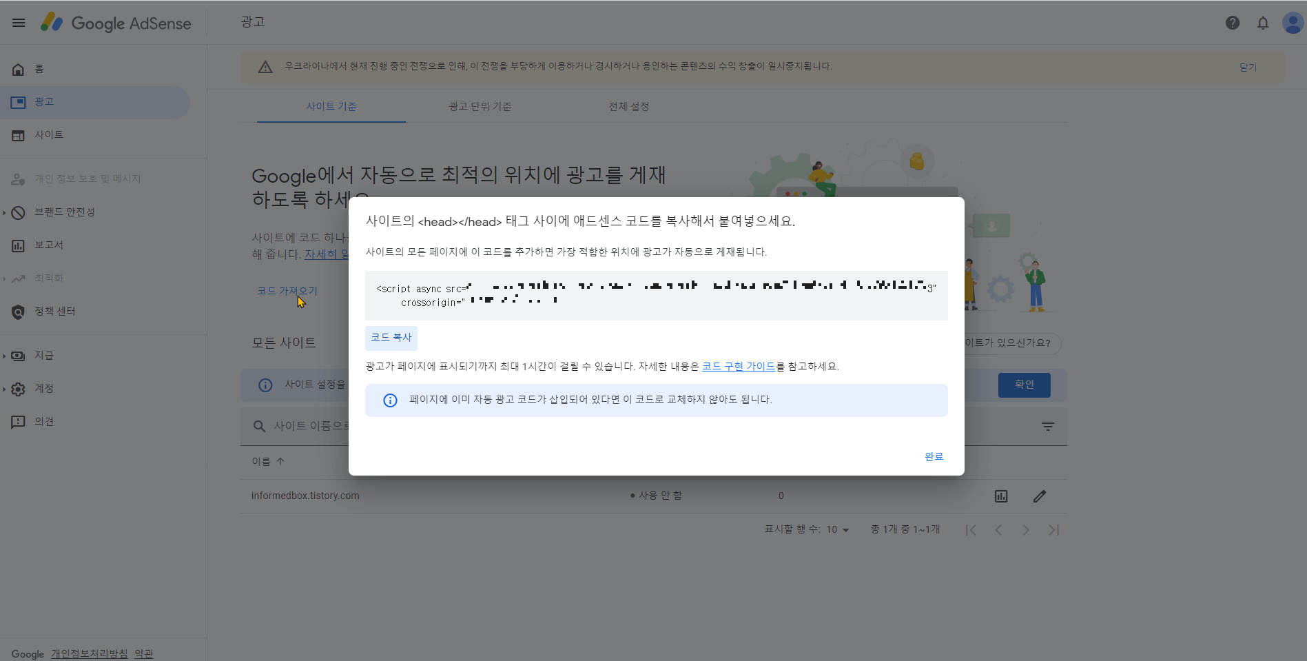 Step 3-4. 이때 구글 애드센스 광고에서 코드 기입 필수 진행.