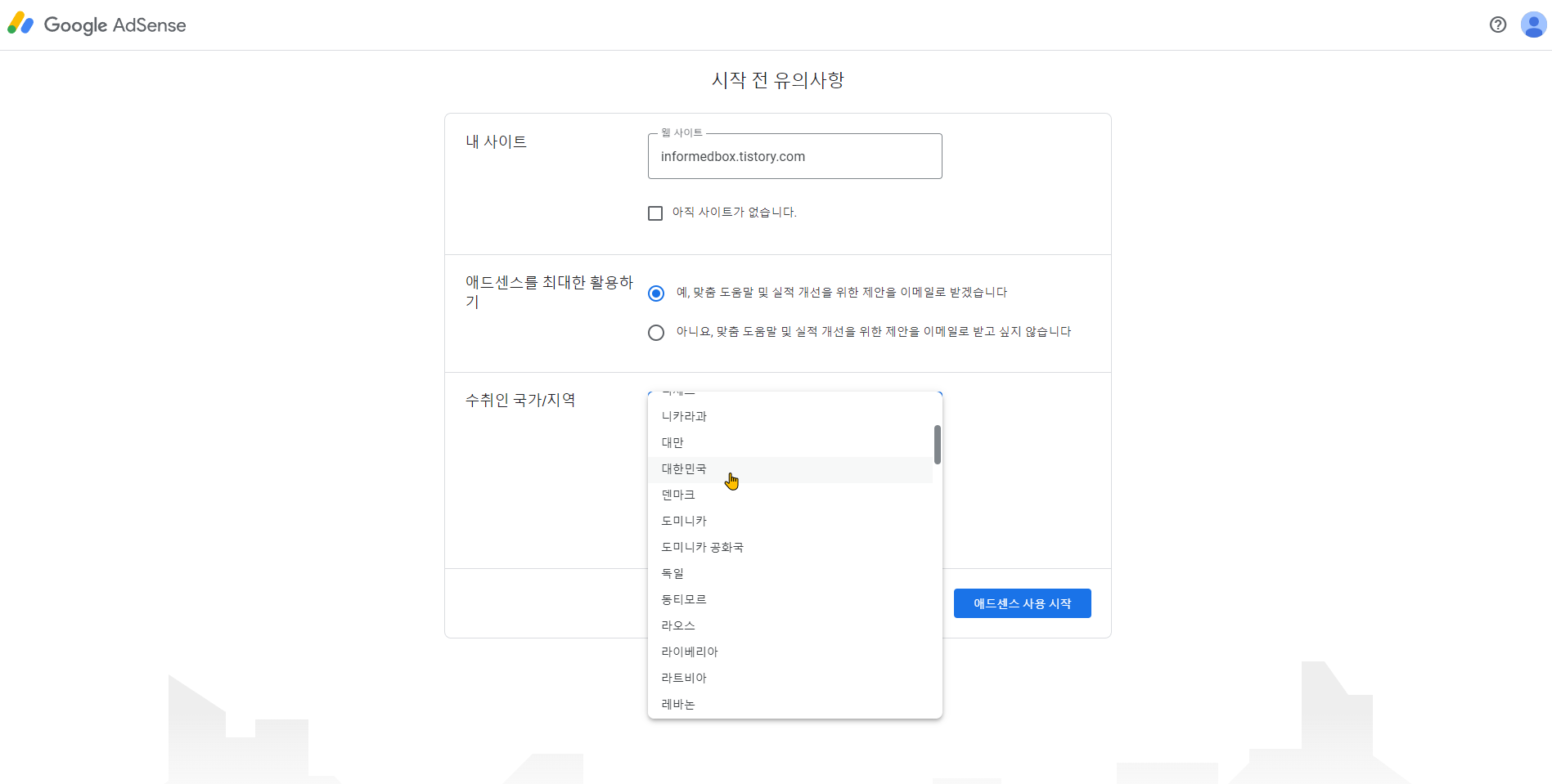 Step 2-2. 수취인 국가 입력 후 약관 동의 후 애드센스 사용 시작.